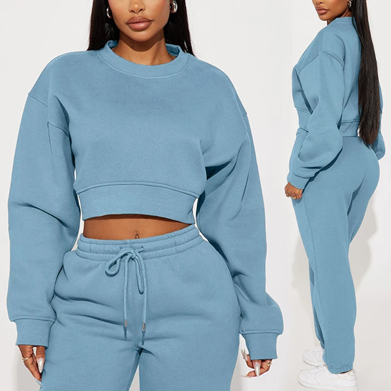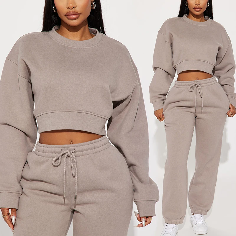Custom Logo 100% Cotton Heavyweight Tracksuits 2 Piece Crop Top and Joggers Sweatpants Sports Sweatshirt Two Piece Sets Women
